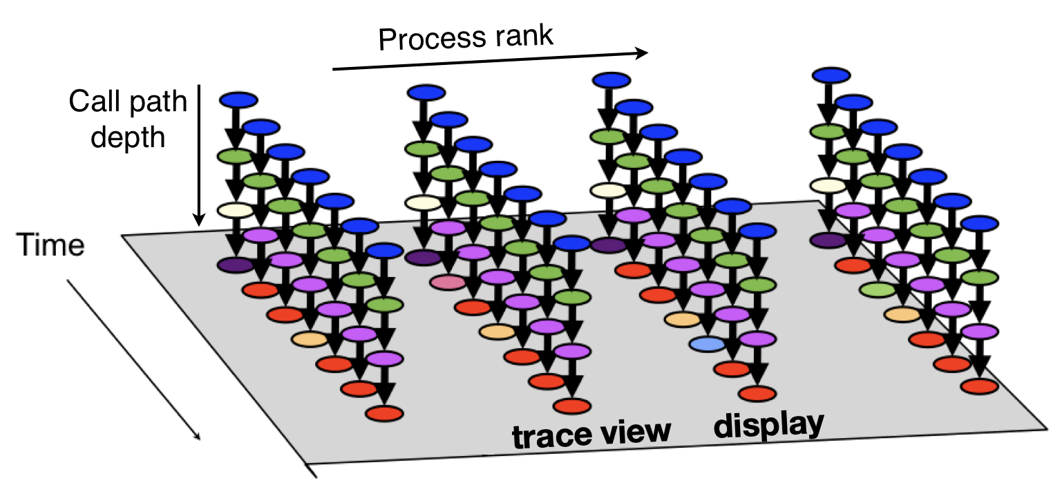 Logical view of trace call path samples on three dimensions: time, execution context (rank/thread/GPU) and call path depth.¶
