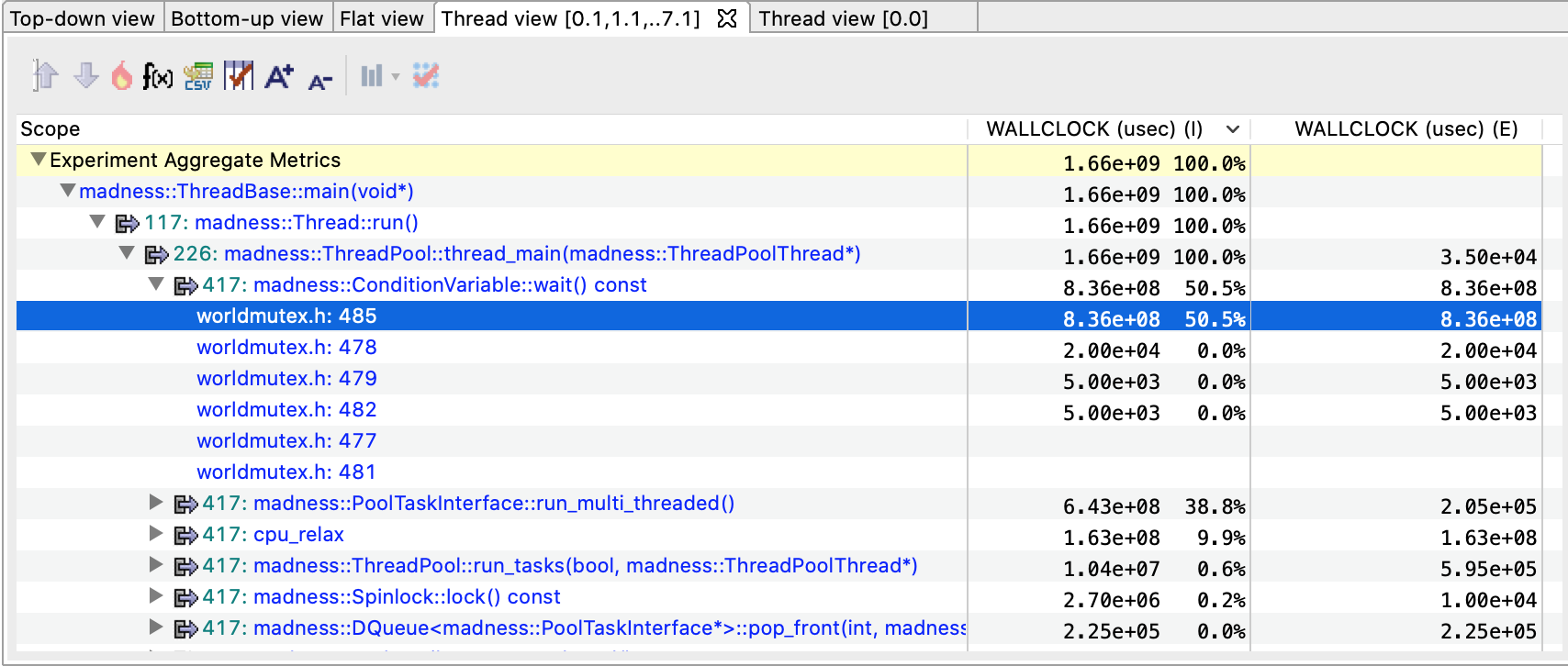 Furthermore, if the filtered nodes are children of a “fake” procedures (such as <program root> and <thread root>), the exclusive metrics in Bottom-up view and flat view can be misleading.
