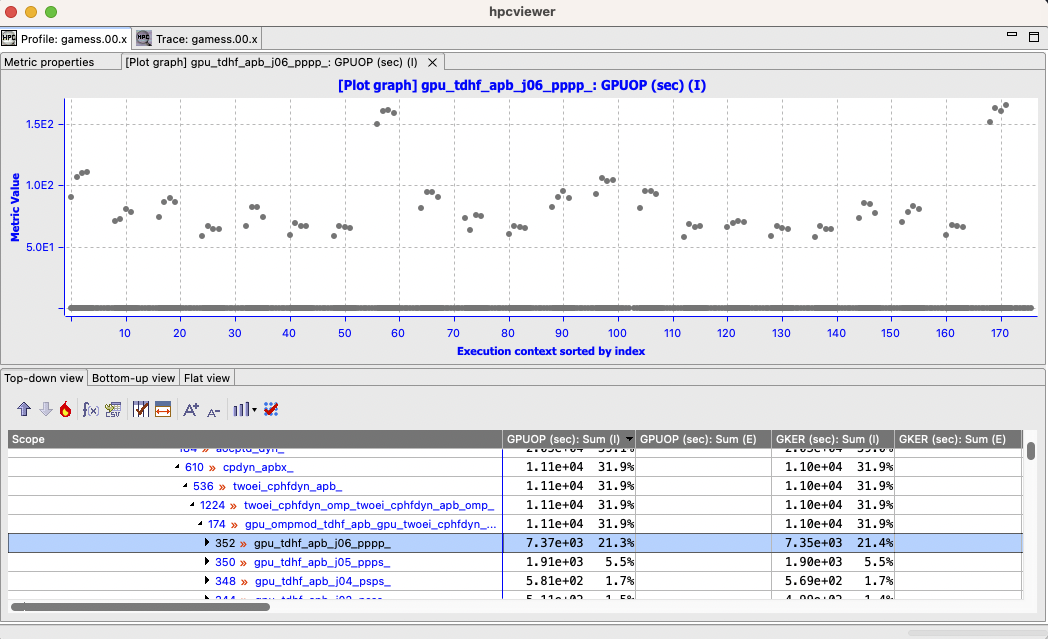 Note that in the Profile view, GPU stream execution contexts are not shown in this view; metrics for a GPU operation are associated with the calling context in the thread that initiated the GPU operation (Section 10.6). In the Trace view, GPU streams have their own trace lines independently from their host so that it allows to separate traces between hosts and devices.