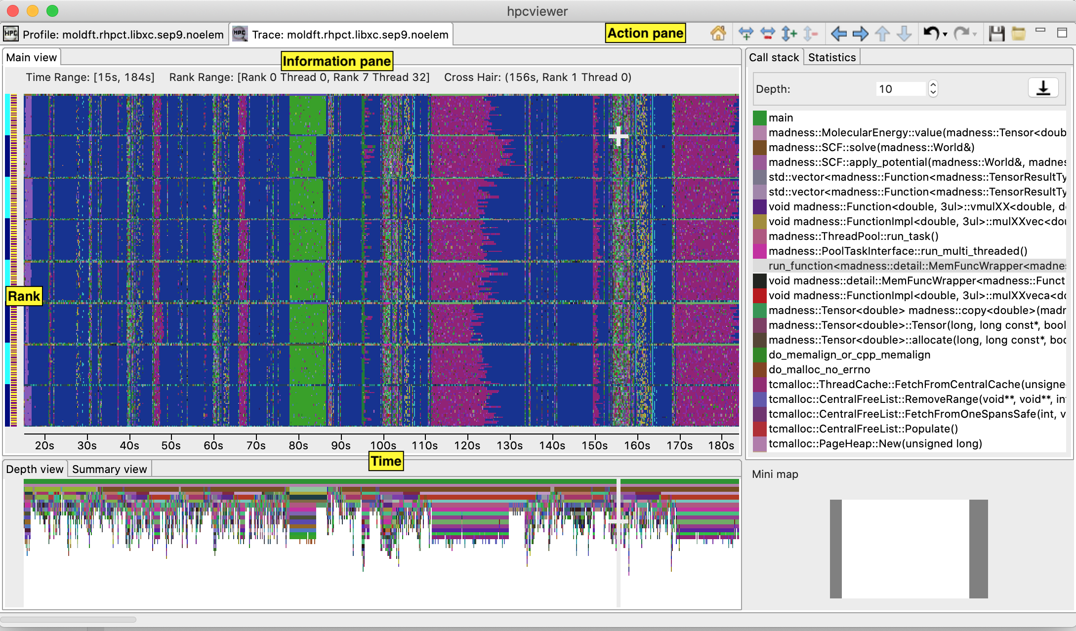 Figures 10.17 and 10.18 show screenshots of Trace view’s capabilities in presenting call path traces. Figure 10.17 highlights Trace view’s four principal window panes: Main View(the main view), Depth View, Call Stack View and Mini Map View, while Figure10.18 shows additional two window panes: Summary View and Statistics View.