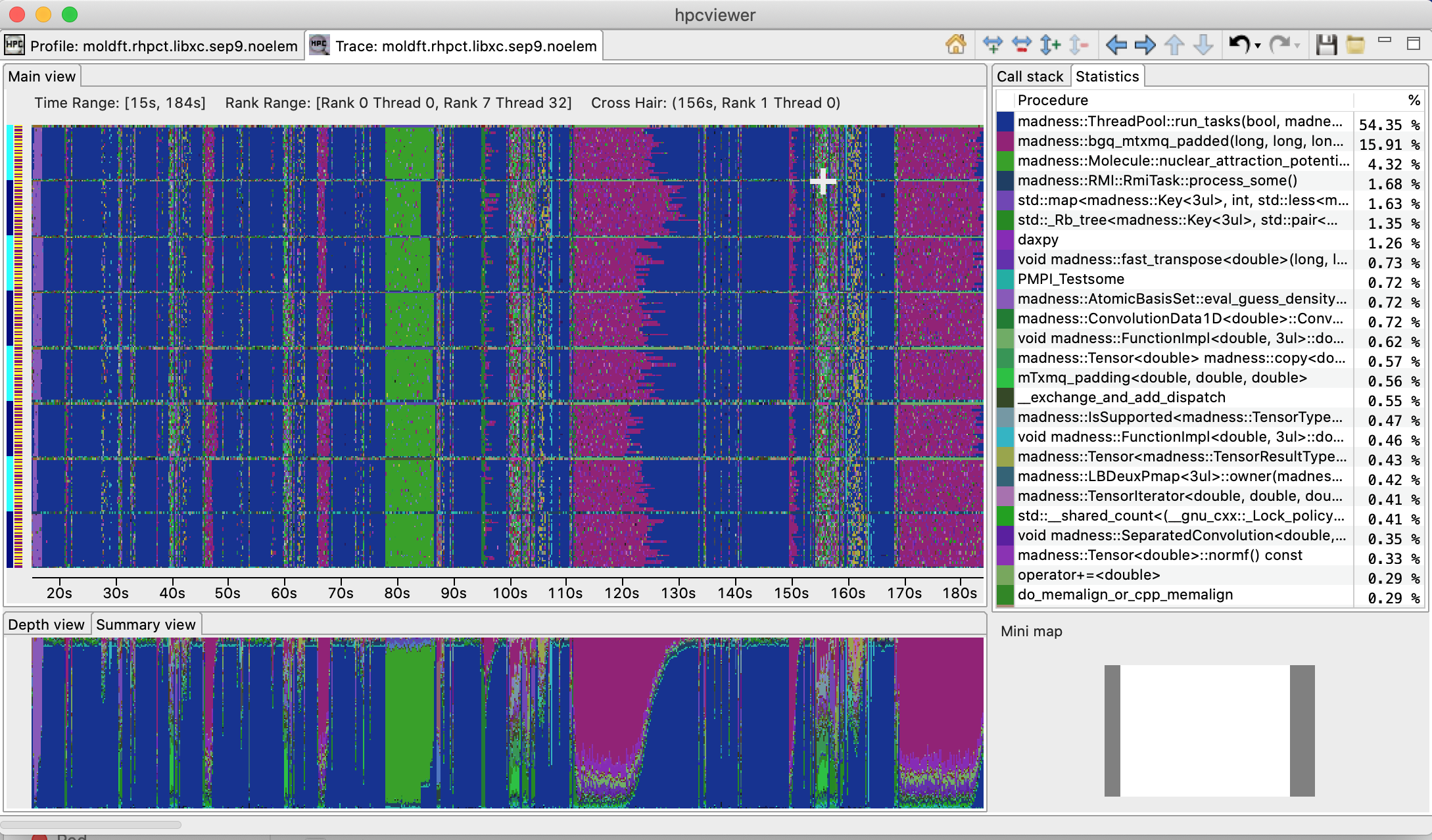 A screenshot of hpcviewer’s Trace view showing the Summary View and Statistics View.¶