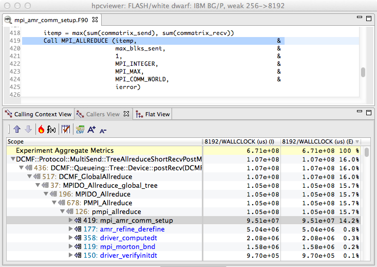 A code-centric view of an execution of the University of Chicago’s FLASH code executing on 8192 cores of a Blue Gene/P. This bottom-up view shows that 16% of the execution time was spent in IBM’s DCMF messaging layer. By tracking these costs up the call chain, we can see that most of this time was spent on behalf of calls to pmpi_allreduce on line 419 of amr_comm_setup.¶