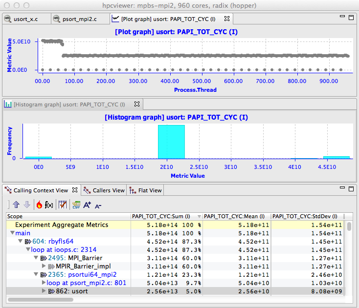 A thread-centric view of the performance of a parallel radix sort application executing on 960 cores of a Cray XE6. The bottom pane shows a calling context for usort in the execution. The top pane shows a graph of how much time each thread spent executing calls to usort from the highlighted context. On a Cray XE6, there is one MPI helper thread for each compute node in the system; these helper threads spent no time executing usort. The graph shows that some of the MPI ranks spent twice as much time in usort as others. This happens because the radix sort divides up the work into 1024 buckets. In an execution on 960 cores, 896 cores work on one bucket and 64 cores work on two. The middle pane shows an alternate view of the thread-centric data as a histogram.¶