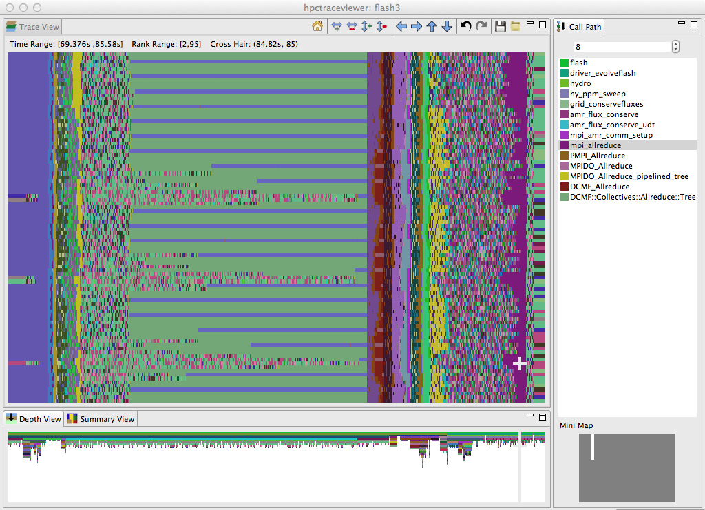 A time-centric view of part of an execution of the University of Chicago’s FLASH code on 256 cores of a Blue Gene/P. The figure shows a detail from the end of the initialization phase and part of the first iteration of the solve phase. The largest pane in the figure shows the activity of cores 2–95 in the execution during a time interval ranging from 69.376s–85.58s during the execution. Time lines for threads are arranged from top to bottom and time flows from left to right. The color at any point in time for a thread indicates the procedure that the thread is executing at that time. The right pane shows the full call stack of thread 85 at 84.82s into the execution, corresponding to the selection shown by the white crosshair; the outermost procedure frame of the call stack is shown at the top of the pane and the innermost frame is shown at the bottom. This view highlights that even though FLASH is an SPMD program, the behavior of threads over time can be quite different. The purple region highlighted by the cursor, which represents a call by all processors to mpi_allreduce, shows that the time spent in this call varies across the processors. The variation in time spent waiting in mpi_allreduce is readily explained by an imbalance in the time processes spend a prior prolongation step, shown in yellow. Further left in the figure, one can see differences among ranks executing on different cores in each node as they await the completion of an mpi_allreduce. A rank executing on one core of each node waits in DCMF_Messager_advance (which appears as blue stripes) while ranks executing on other cores in each node wait in a helper function (shown in green). In this phase, ranks await the delayed arrival of a few of their peers who have extra work to do inside simulation_initblock before they call mpi_allreduce.¶